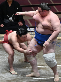 一方、宇良には若隆景。宇良が立ち合い低く右四つからマワシをねらったろころ若隆景よく持ち堪え押し出しを決めた。勢い余った宇良は土俵下へと跳んでいく。